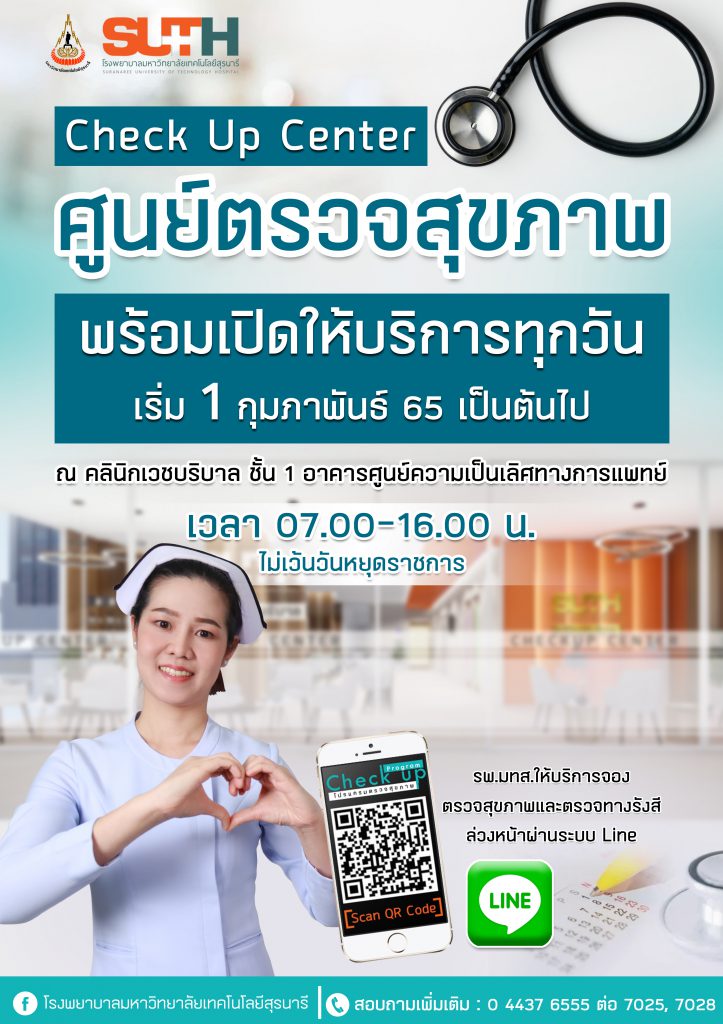 ประชาสัมพันธ์ : ศูนย์ตรวจสุขภาพ รพ.มทส. พร้อมเปิดให้บริการทุกวัน ชั้น 1 คลินิกเวชบริบาล