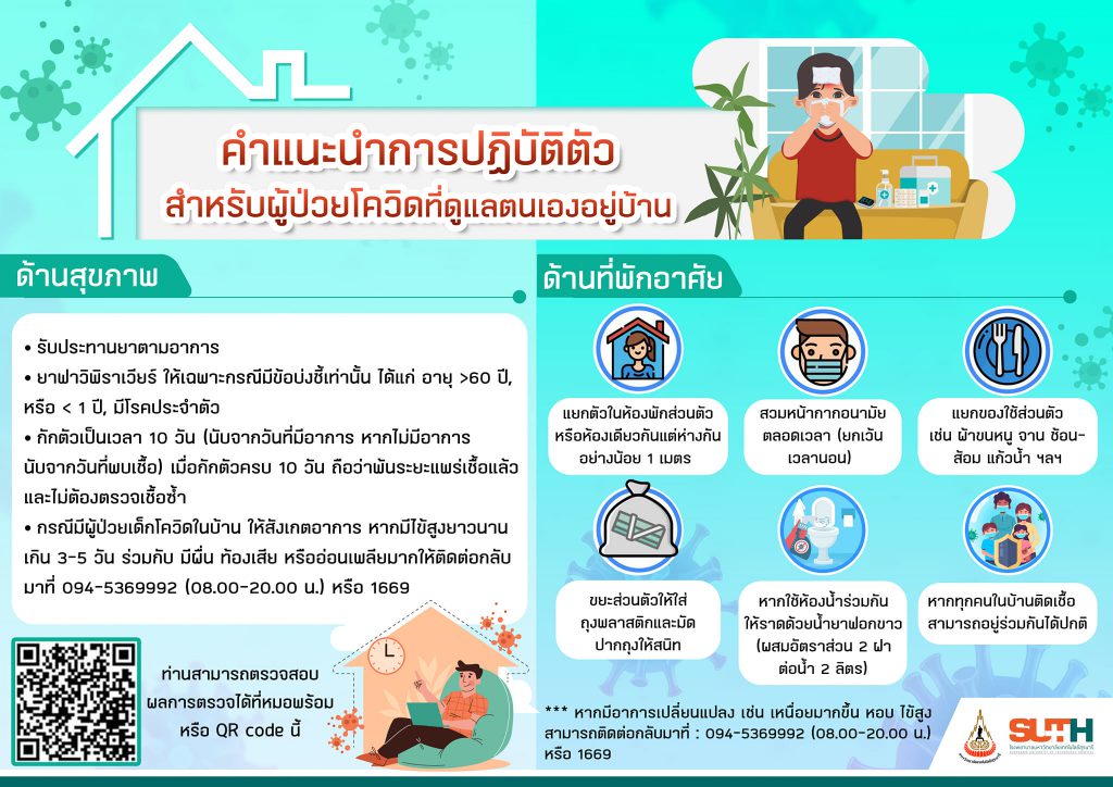 “คำแนะนำการปฏิบัติตัว สำหรับผู้ป่วยโควิด 19 ที่ดูแลตนเองอยู่บ้าน หนึ่งในมาตรการสาธารณสุขเพื่อรักษาผู้ติดเชื้อโควิด 19 ทั้งนี้ อยู่ภายใต้การพิจารณาของแพทย์ และความพร้อมของสถานที่พักอาศัยระหว่างกักตัว ผู้ป่วยจะได้การตรวจสอบ ติดตามอาการเป็นประจำทุกวัน หากอาการเปลี่ยนแปลงก็มีระบบส่งต่อไปรักษาตัวที่โรงพยาบาล”