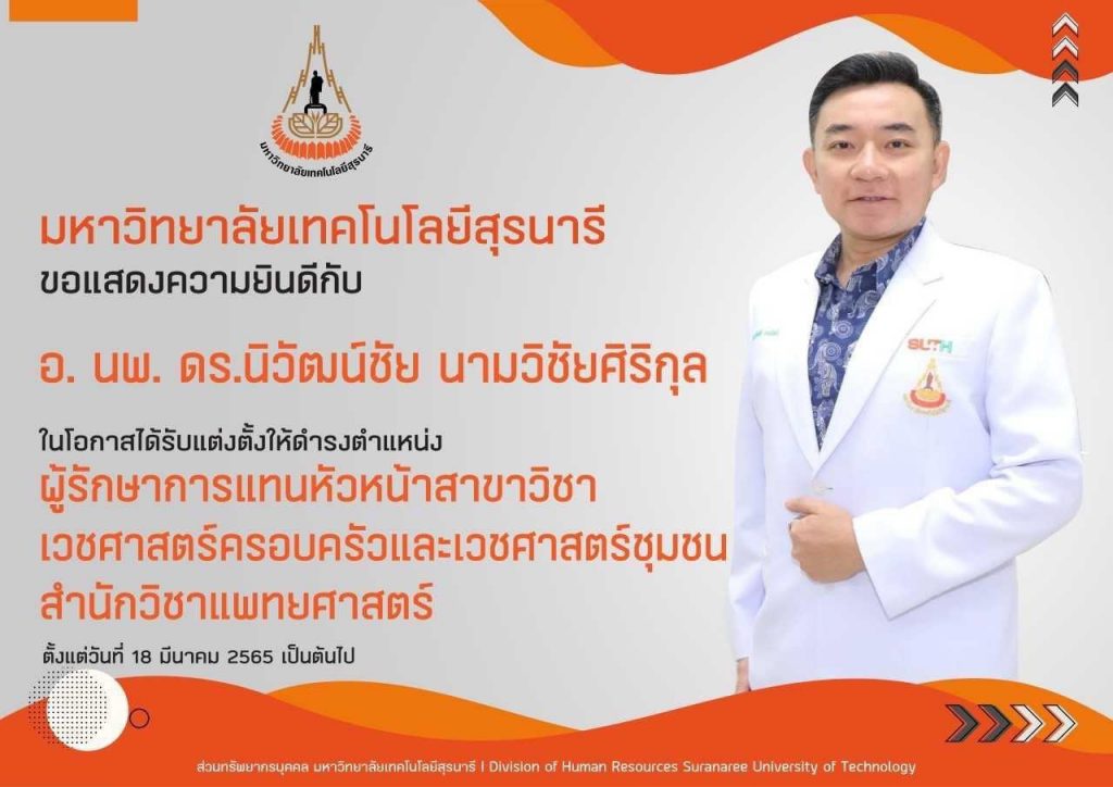ขอแสดงความยินดีกับ อ.นพ.ดร. นิวัฒน์ชัย นามวิชัยศิริกุล ในโอกาสได้รับแต่งตั้งให้ดำรงตำแหน่ง ผู้รักษาการแทนหัวหน้าสาขาวิชาเวชศาสตร์ครอบครัวและเวชศาสตร์ชุมชน