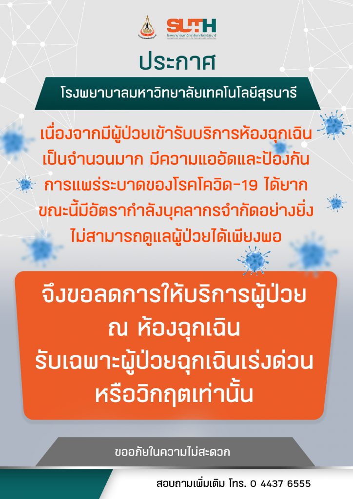 ประกาศ โรงพยาบาลมหาวิทยาลัยเทคโนโลยีสุรนารีเนื่องจากมีผู้ป่วยเข้ารับบริการห้องฉุกเฉินเป็นจำนวนมาก มีความแออัดและป้องกันการแพร่ระบาดของโรคโควิด-19 ได้ยาก ขณะนี้มีอัตรากำลังบุคลากรจำกัดอย่างยิ่งไม่สามารถดูแลผู้ป่วยได้เพียงพอ จึงขอลดการให้บริการผู้ป่วย ณ ห้องฉุกเฉินรับเฉพาะผู้ป่วยฉุกเฉินเร่งด่วนหรือวิกฤตเท่านั้นขออภัยในความไม่สะดวก