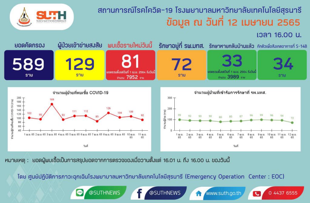 ประกาศ โรงพยาบาลมหาวิทยาลัยเทคโนโลยีสุรนารีรายงานสถานการณ์โควิด-19 รพ.มทส. วันที่ 13 เมษายน 2565