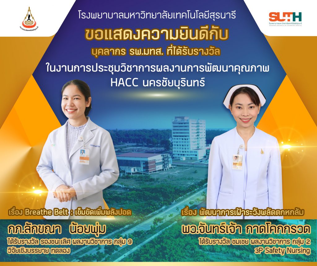 ประชาสัมพันธ์ : ขอแสดงความยินดีกับ บุคลากร รพ.มทส. ที่ได้รับรางวัลในงานการประชุมวิชาการผลงานการพัฒนาคุณภาพ HACC นครชัยบุรินทร์