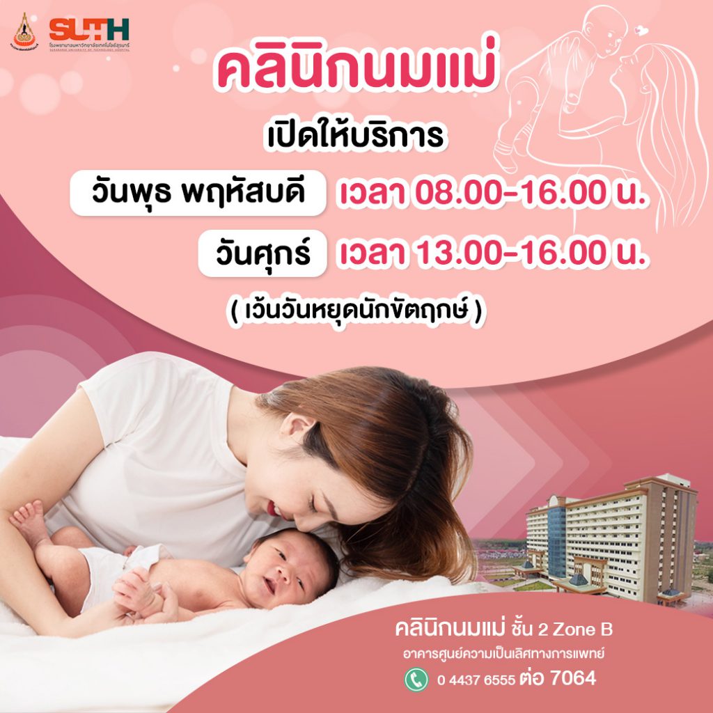ที่ปรึกษาดีๆ ของคุณแม่ ในการเลี้ยงลูกด้วยนมแม่น้ำนมแม่ เป็นอาหารที่ดีที่สุดสำหรับลูกน้อย โดยเฉพาะในช่วง 6 เดือนแรกของลูก ควรให้ลูกดื่มแต่น้ำนมแม่อย่างเดียวโดยไม่จำเป็นต้องรับประทานน้ำหรืออาหารอื่นๆ เพิ่มเติม เพราะในน้ำนมแม่มีสารอาหารครบถ้วน และเพียงพอกับความต้องการของลูกน้อยคลินิกนมแม่ โรงพยาบาลมหาวิทยาลัยเทคโนโลยีสุรนารี พร้อมให้บริการช่วยเหลือคุณแม่มือใหม่ เพื่อส่งเสริมการเลี้ยงลูกด้วยนมแม่และแก้ไขปัญหาต่างๆ ที่คุณแม่มือใหม่ต้องเผชิญ