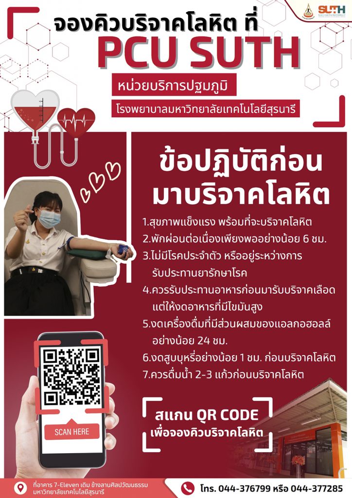 ประชาสัมพันธ์ : จองคิวบริจาคโลหิตที่ หน่วยบริการปฐมภูมิ รพ.มทส. PCU-SUTH