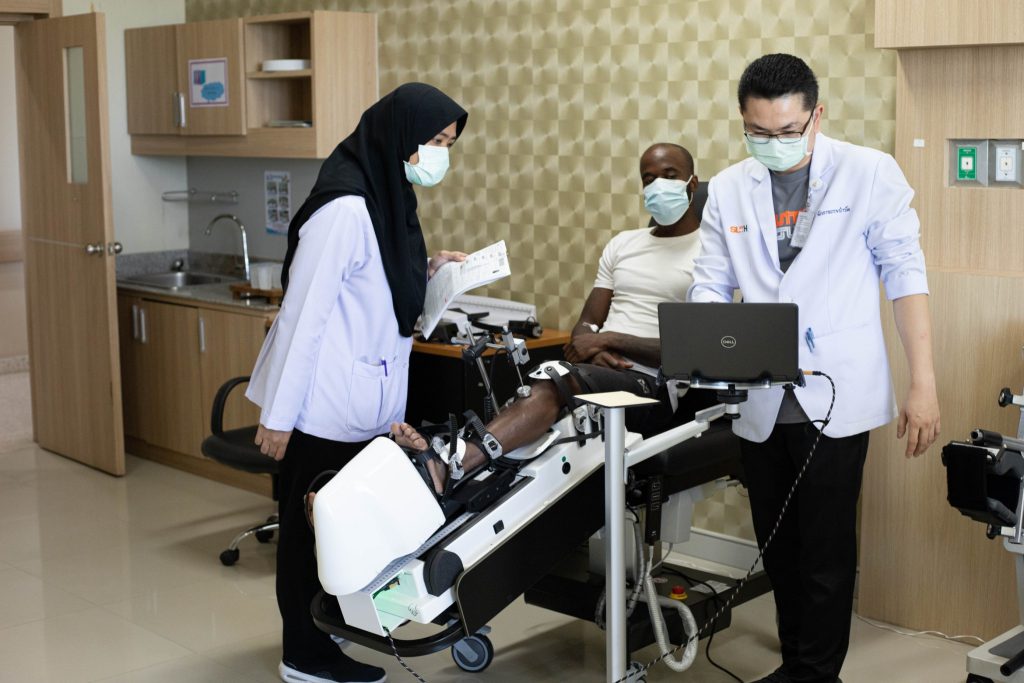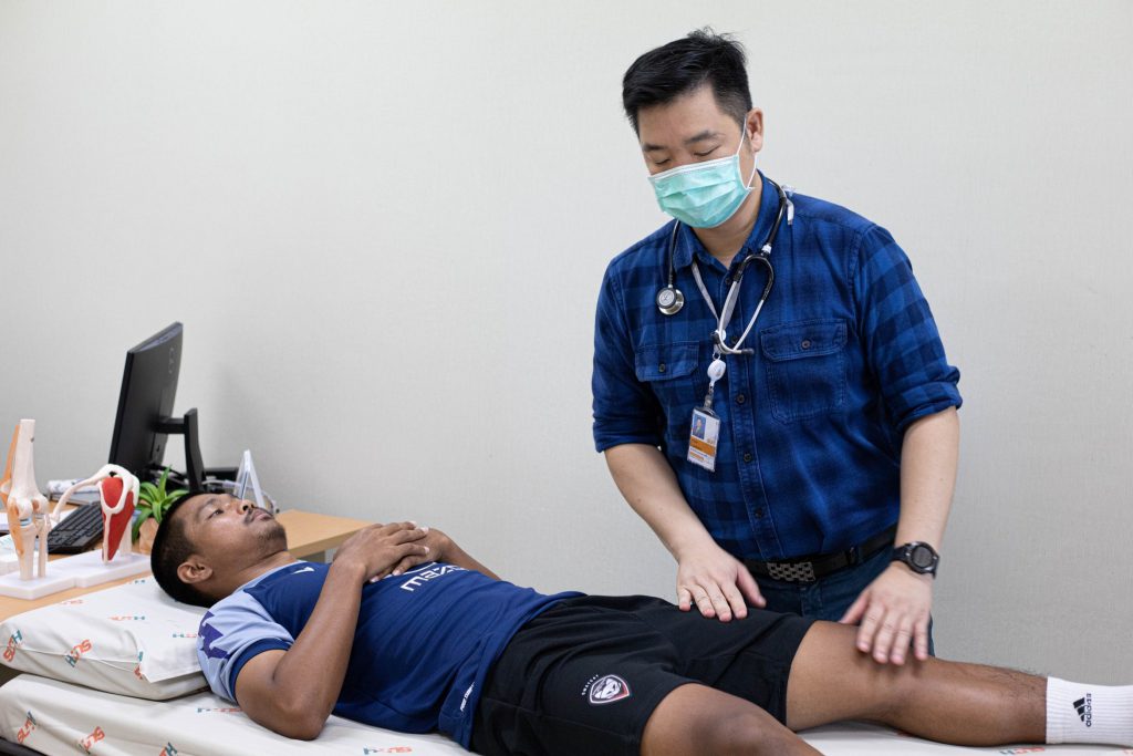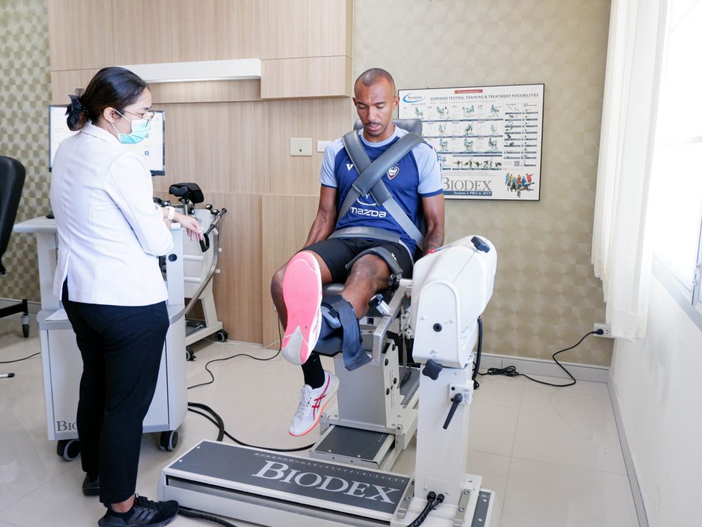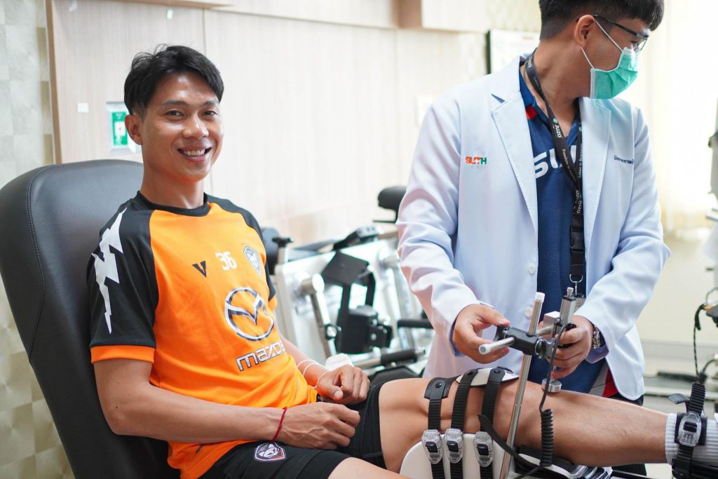 วันที่ 4 และ 13 กรกฎาคม 2566 เวลาประมาณ 08.00 น. โรงพยาบาลมหาวิทยาลัยเทคโนโลยีสุรนารี ณ Wellness Center ชั้น 11 อาคารรัตนเวชพัฒน์ อ.นพ.สุวิทยา เธียรประธาน หัวหน้าสาขาคลินิกศัลยกรรมกระดูกและข้อ และทีมกายภาพบำบัด ได้ให้บริการตรวจสุขภาพกับนักกีฬาสโมสรฟุตบอลนครราชสีมา มาสด้า เอฟซี โดยคุณจุนรัตน์ วรครบุรี นักกายภาพบำบัดประจำทีม ได้นำเหล่านักเตะทีม Swat Cat เข้าตรวจสุขภาพ รวมถึงตรวจความแข็งแรงของกล้ามเนื้อแบบไอโซเมตริก ซึ่งเป็นเครื่องตรวจความแข็งแรงของกล้ามเนื้อสำหรับนักกีฬาโดยเฉพาะ