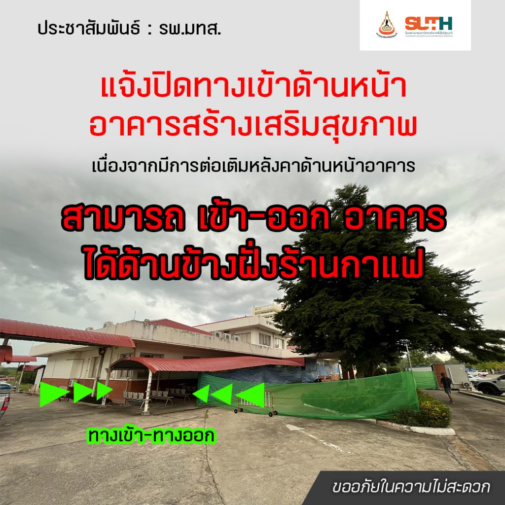 ประชาสัมพันธ์ : รพ.มทส. แจ้งปิดทางเข้าด้านหน้าอาคารสร้างเสริมสุขภาพ เนื่องจากมีการต่อเติมหลังคาด้านหน้าอาคาร สามารถ เข้า-ออก อาคารได้ด้านข้างฝั่งร้านกาแฟ