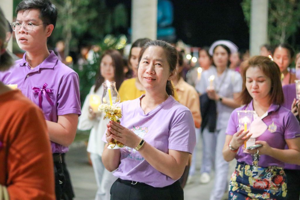 วันที่ 15 กุมภาพันธ์ 2567 เวลา 17.00-19.00 น. ณ ลานธรรมาภิรมย์ โรงพยาบาลมหาวิทยาลัยเทคโนโลยีสุรนารี ร่วมสืบทอดส่งเสริมประเพณีสำคัญเนื่องในโอกาสแห่งวันสำคัญทางพระพุทธศาสนาในเดือนกุมภาพันธ์ ภายใต้โครงการส่งเสริมความสุขและความผูกพันของบุคลากร ในกิจกรรม “มาฆปุณณมีบูชา” ประธานฝ่ายสงฆ์ พระราชวชิรสีมาภรณ์ รองเจ้าคณะจังหวัดนครราชสีมา วัดพระนารายณ์มหาราช วรวิหาร ในการนี้ได้รับเกียรติจาก ผศ.ดร. พงษ์ชัย จิตตะมัย รองอธิการบดีฝ่ายการเงิน ทรัพย์สิน และวิสาหกิจ เป็นประธาน จุดธูปเทียนบูชาพระรัตนตรัย พร้อมด้วย อ.นพ. วุฒิพงษ์ ศรีรัตน์ธนารัก คณะผู้บริหาร และบุคลากร รพ.มทส. ร่วมพิธี ซึ่งในเวลาต่อมาพระสงฆ์นำสวดมนต์ทำวัตรเย็น แสดงธรรมเทศนา นำจุดประทีปบูชา เวียนเทียน และวางพวงมาลัยถวายองค์พระพุทธสิริธัมมาคุณากร เพื่อสร้างความเป็นสิริมงคลแก่บุคลากร และประชาชนทั่วไป ทำนุบำรุงพระพุทธศาสนาให้เจริญรุ่งเรือง ต่อไป