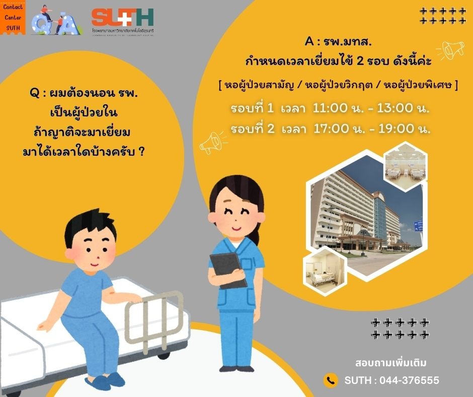 ⏰เวลาเยี่ยมไข้ รพ.มทส. มี 2 รอบ ดังนี้ รอบที่ 1 เวลา 11:00 – 13:00 น. รอบที่ 2 เวลา 17:00 – 19:00 น.