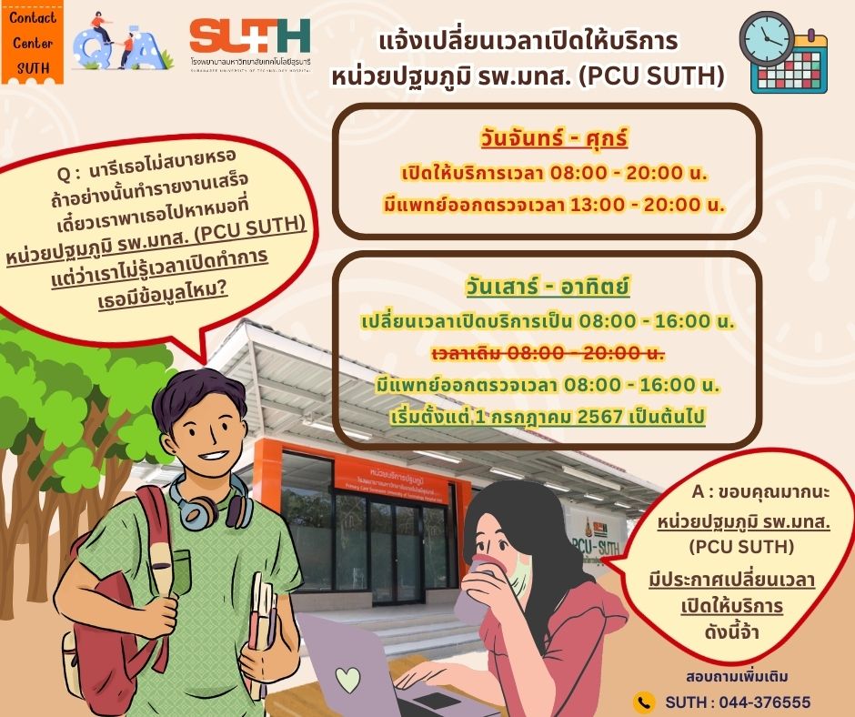 โรงพยาบาลมหาวิทยาลัยเทคโนโลยีสุรนารี 111 ถ.มหาวิทยาลัย ต.สุรนารี อ.เมือง จ.นครราชสีมา โทร 0 4437 6555 , แฟกส์ 0 4437 6999 www.suth.go.th