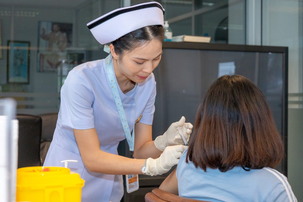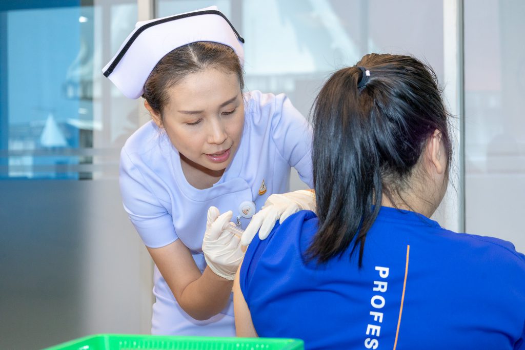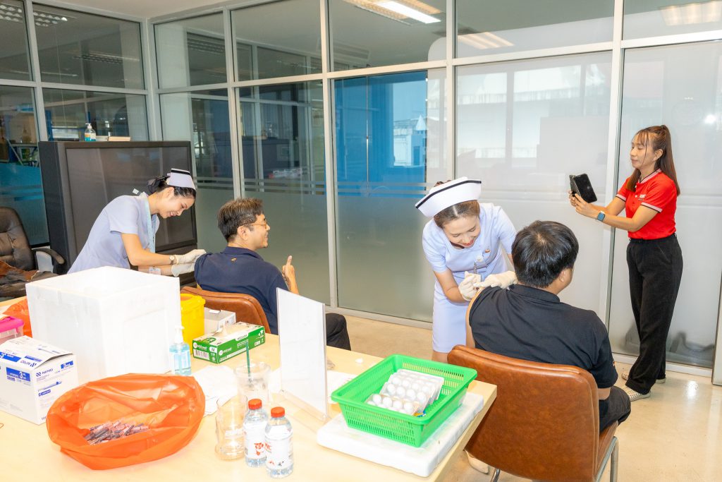 ออกหน่วยให้บริการฉีดวัคซีนไข้หวัดใหญ่ 4 สายพันธุ์ แก่พนักงานบริษัท บุญไทยแมชชีนเนอรี่ คอมเพล็กซ์ จำกัด ไข้หวัดใหญ่สามารถป้องกันได้ด้วย การฉีดวัคซีนซึ่งเป็นวัคซีนที่ฉีดเข้ากล้ามเนื้อ โดยใช้เวลา 2 สัปดาห์ในการสร้างภูมิคุ้มกันช่วยป้องกันการติดเชื้อไข้หวัดใหญ่ สายพันธุ์เดียวกันหรือสายพันธุ์ที่ใกล้เคียงกับที่บรรจุในวัคซีน ภูมิคุ้มกันอยู่ได้ประมาณ 1 ปี จึงควรฉีดเป็นประจำทุกปี หากเกิดการติดเชื้อในระบบทางเดินหายใจ ในรายที่รุนแรง เชื้อไวรัส Influenza ก็อาจลงสู่ปอดทำให้เกิดอาการแทรกซ้อนปอดบวมได้ไข้หวัดใหญ่พบได้ตลอดทั้งปี