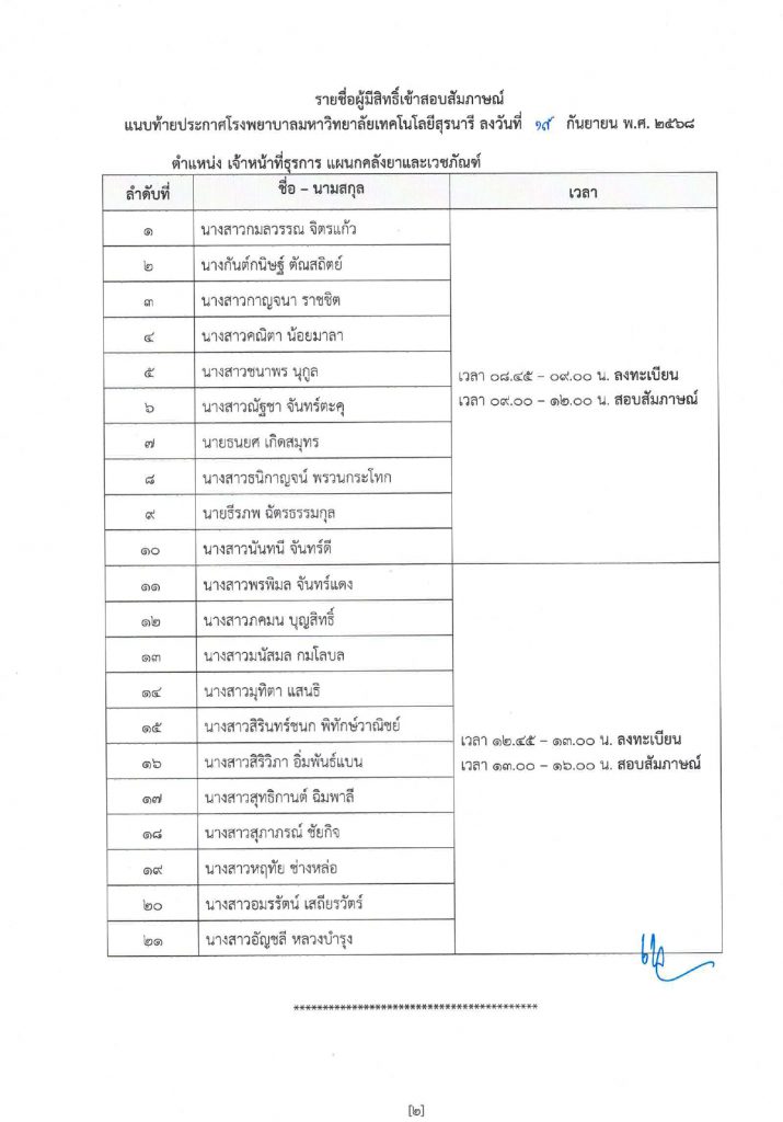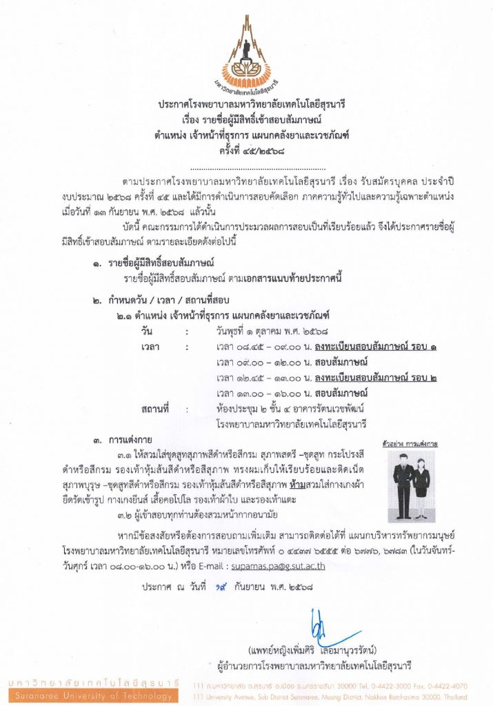 ประกาศโรงพยาบาลมหาวิทยาลัยเทคโนโลยีสุรนารี เรื่อง รายชื่อผู้มีสิทธิ์เข้าสอบสัมภาษณ์ ตำแหน่ง เจ้าหน้าที่ธุรการ แผนกคลังยาและเวชภัณฑ์ ครั้งที่ 45/2568