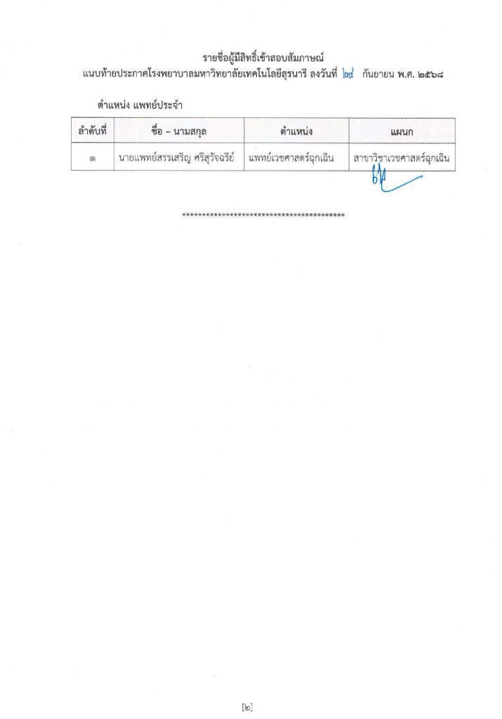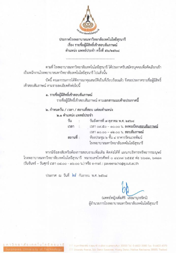 ประกาศโรงพยาบาลมหาวิทยาลัยเทคโนโลยีสุรนารี เรื่อง รายชื่อผู้มีสิทธิ์เข้าสอบสัมภาษณ์ ตำแหน่ง แพทย์ประจำ ครั้งที่ 56/2568