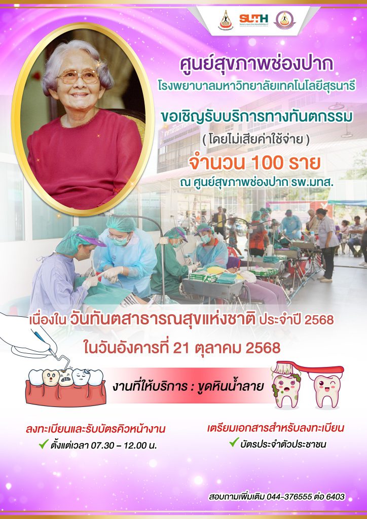 จัดโดย : ศูนย์สุขภาพช่องปาก โรงพยาบาลมหาวิทยาลัยเทคโนโลยีสุรนารี ร่วมกับ สำนักวิชาทันตแพทยศาสตร์มหาวิทยาลัยเทคโนโลยีสุรนารี