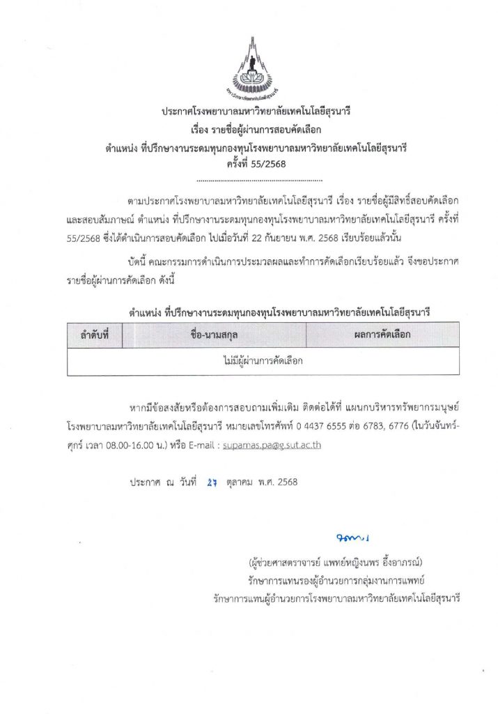 ประกาศโรงพยาบาลมหาวิทยาลัยเทคโนโลยีสุรนารี เรื่อง รายชื่อผู้ผ่านการสอบคัดเลือก ตำแหน่ง ที่ปรึกษางานระดมทุนกองทุนโรงพยาบาลมหาวิทยาลัยเทคโนโลยีสุรนารี ครั้งที่ 55/2568