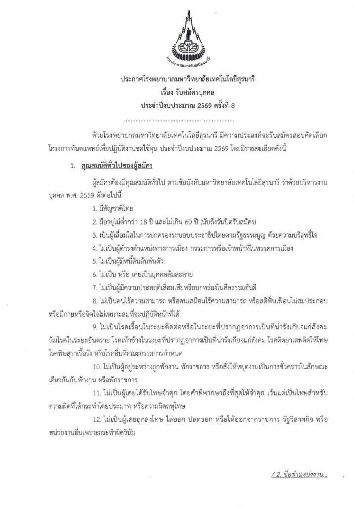 ประกาศโรงพยาบาลมหาวิทยาลัยเทคโนโลยีสุรนารี เรื่อง รับสมัครบุคคล ประจำปีงบประมาณ 2569 ครั้งที่ 8