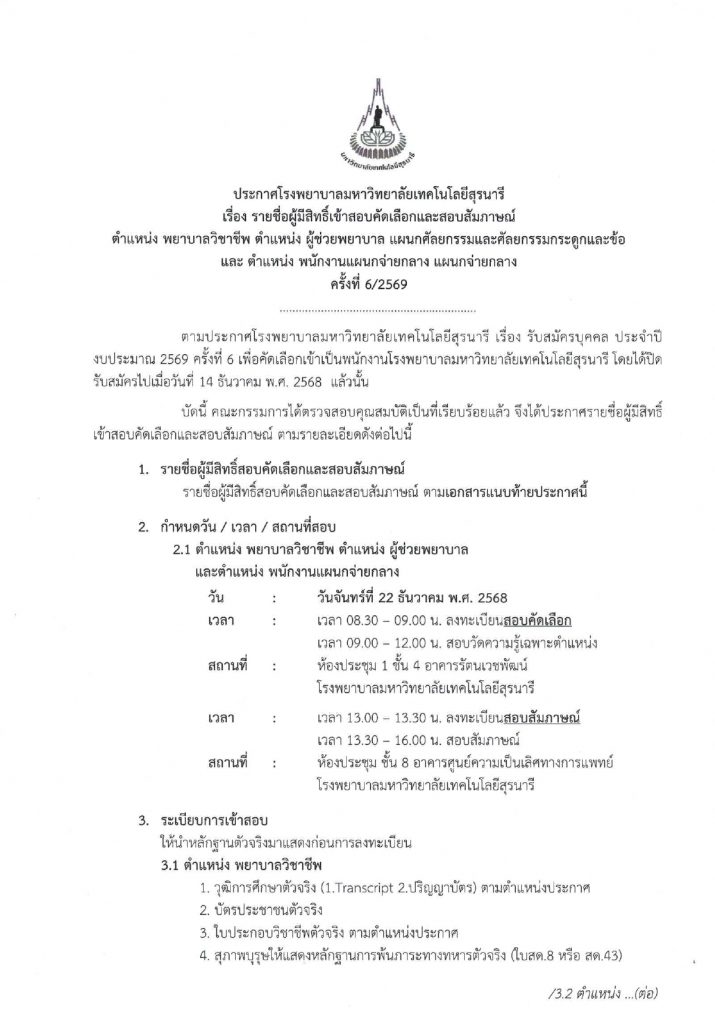 ประกาศโรงพยาบาลมหาวิทยาลัยเทคโนโลยีสุรนารี เรื่อง รายชื่อผู้มีสิทธิ์เข้าสอบคัดเลือกและสอบสัมภาษณ์ ตำแหน่ง พยาบาลวิชาชีพ ตำแหน่ง ผู้ช่วยพยาบาล แผนกศัลยกรรมและศัลยกรรมกระดูกและข้อ และ ตำแหน่ง พนักงานแผนกจ่ายกลาง แผนกจ่ายกลาง ครั้งที่ 6/2569