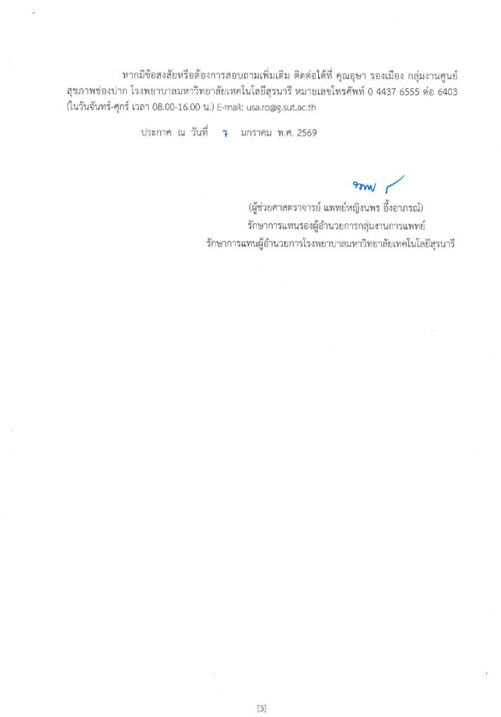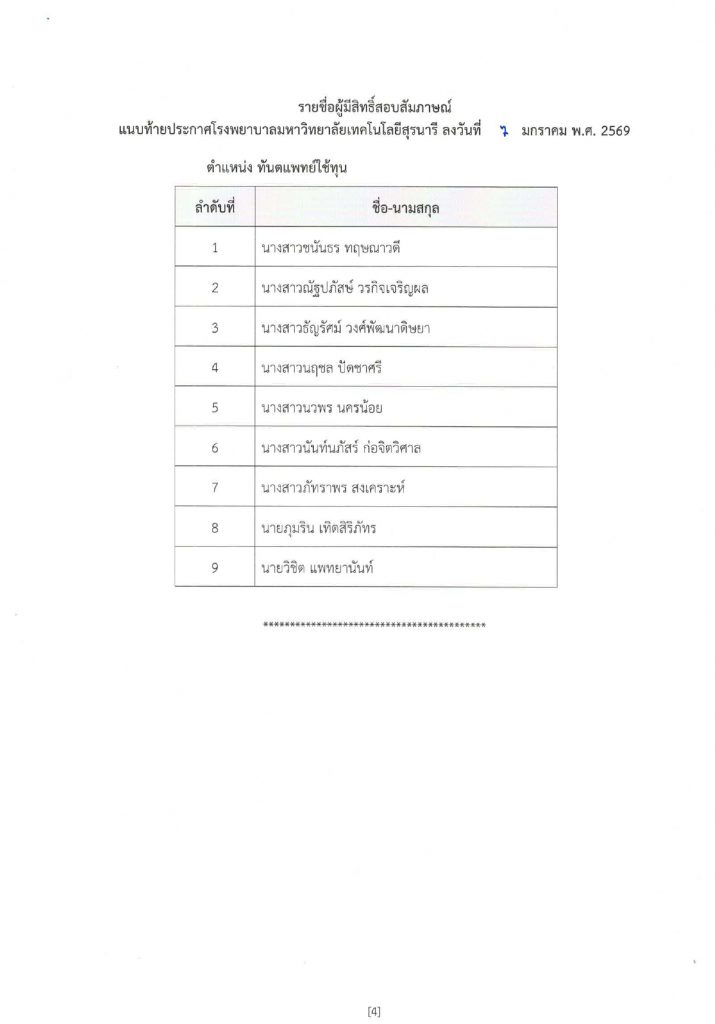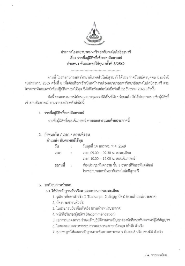 ประกาศโรงพยาบาลมหาวิทยาลัยเทคโนโลยีสุรนารี เรื่อง รายชื่อผู้มีสิทธิ์เข้าสอบสัมภาษณ์ ตำแหน่งทันตแพทย์ใช้ทุน ครั้งที่ 8/2569