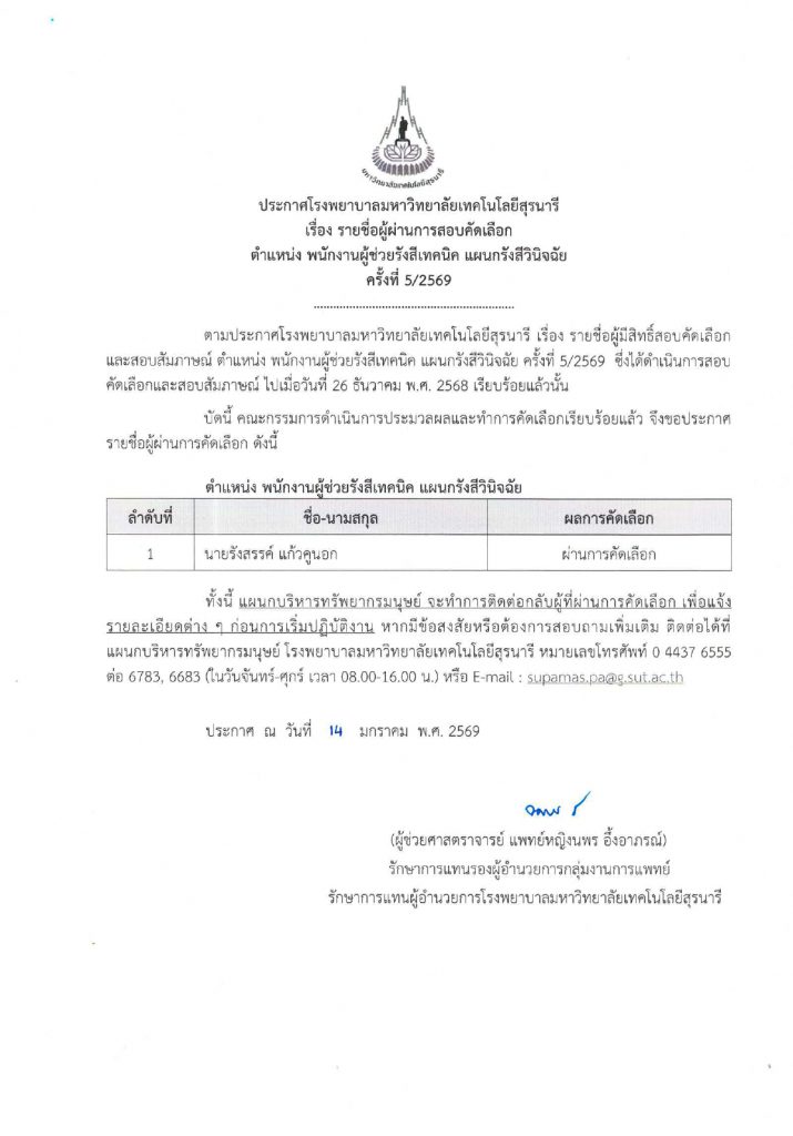 ประกาศโรงพยาบาลมหาวิทยาลัยเทคโนโลยีสุรนารี เรื่อง รายชื่อผู้ผ่านการสอบคัดเลือก ตำแหน่ง พนักงานผู้ช่วยรังสีเทคนิค แผนกรังสีวินิจฉัย ครั้งที่ 5/2569