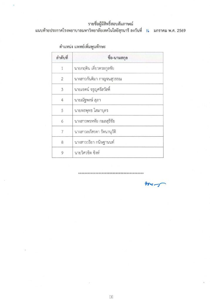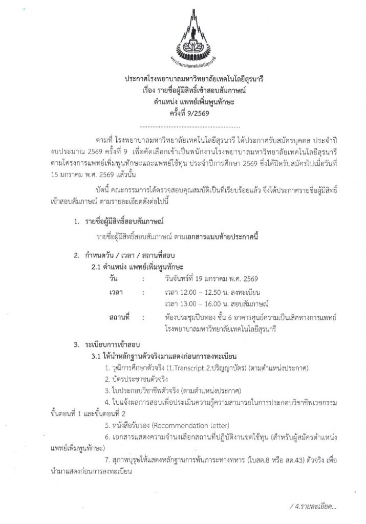 ประกาศโรงพยาบาลมหาวิทยาลัยเทคโนโลยีสุรนารี เรื่อง รายชื่อผู้มีสิทธิ์เข้าสอบสัมภาษณ์ ตำแหน่ง แพทย์เพิ่มพูนทักษะ ครั้งที่ 9/2569
