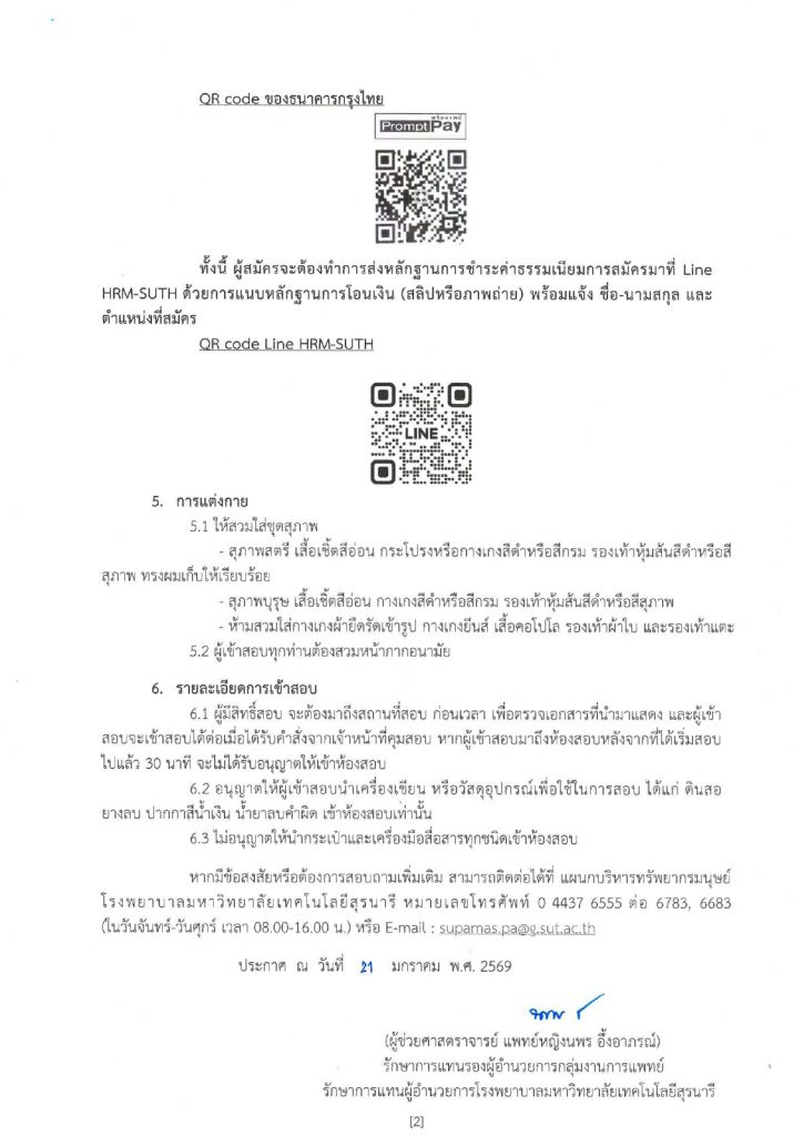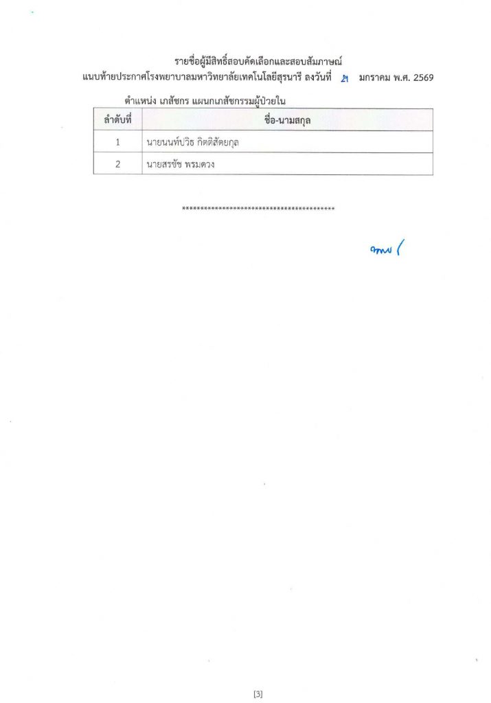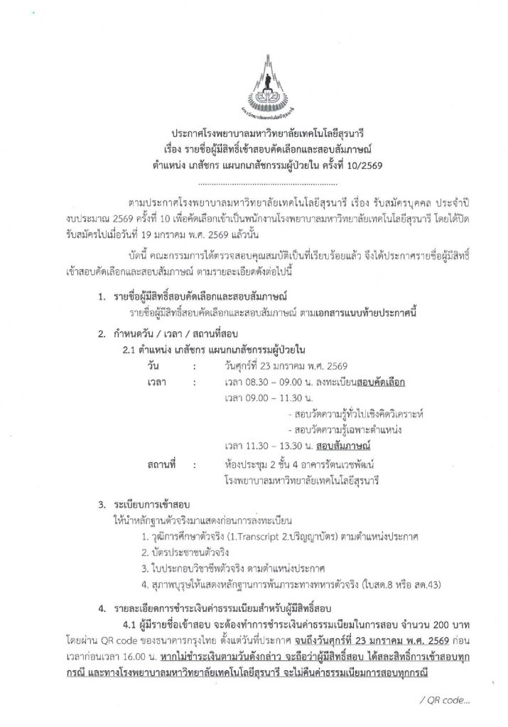 ประกาศโรงพยาบาลมหาวิทยาลัยเทคโนโลยีสุรนารี เรื่อง รายชื่อผู้มีสิทธิ์เข้าสอบคัดเลือกและสอบสัมภาษณ์ ตำแหน่ง เภสัชกร แผนกเภสัชกรรมผู้ป่วยใน ครั้งที่ 10/2569