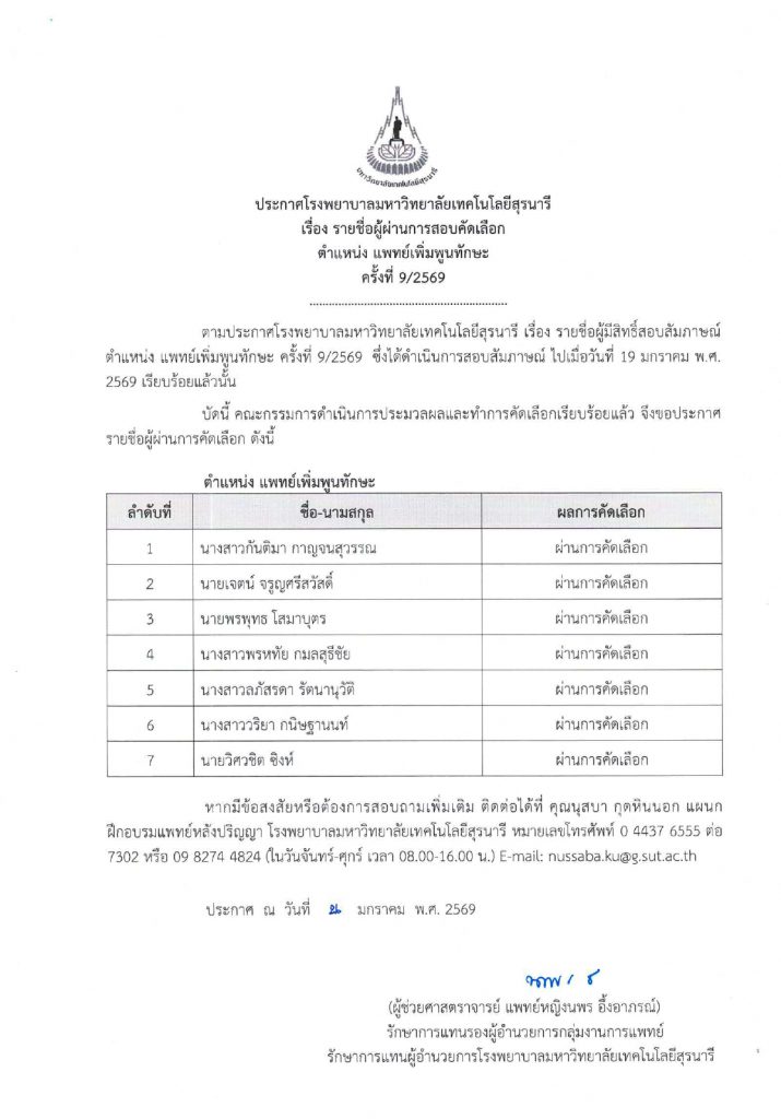 ประกาศโรงพยาบาลมหาวิทยาลัยเทคโนโลยีสุรนารี เรื่อง รายชื่อผู้ผ่านการสอบคัดเลือก ตำแหน่ง แพทย์เพิ่มพูนทักษะ ครั้งที่ 9/2569