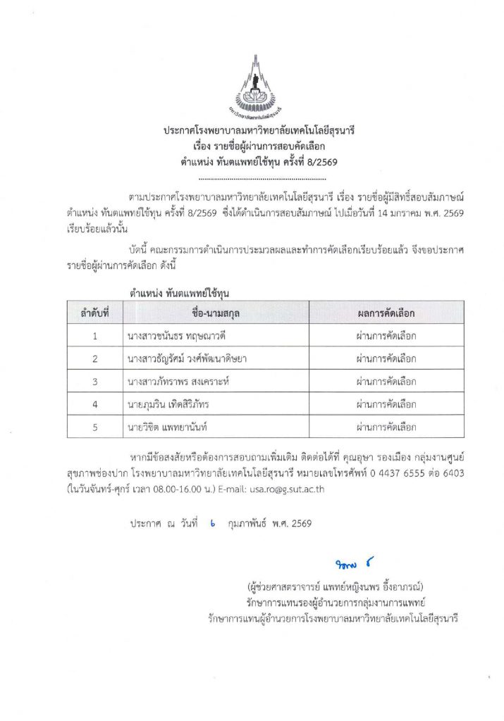 ประกาศโรงพยาบาลมหาวิทยาลัยเทคโนโลยีสุรนารี เรื่อง รายชื่อผู้ผ่านการสอบคัดเลือก ตำแหน่ง ทันตแพทย์ใช้ทุน ครั้งที่ 8/2569