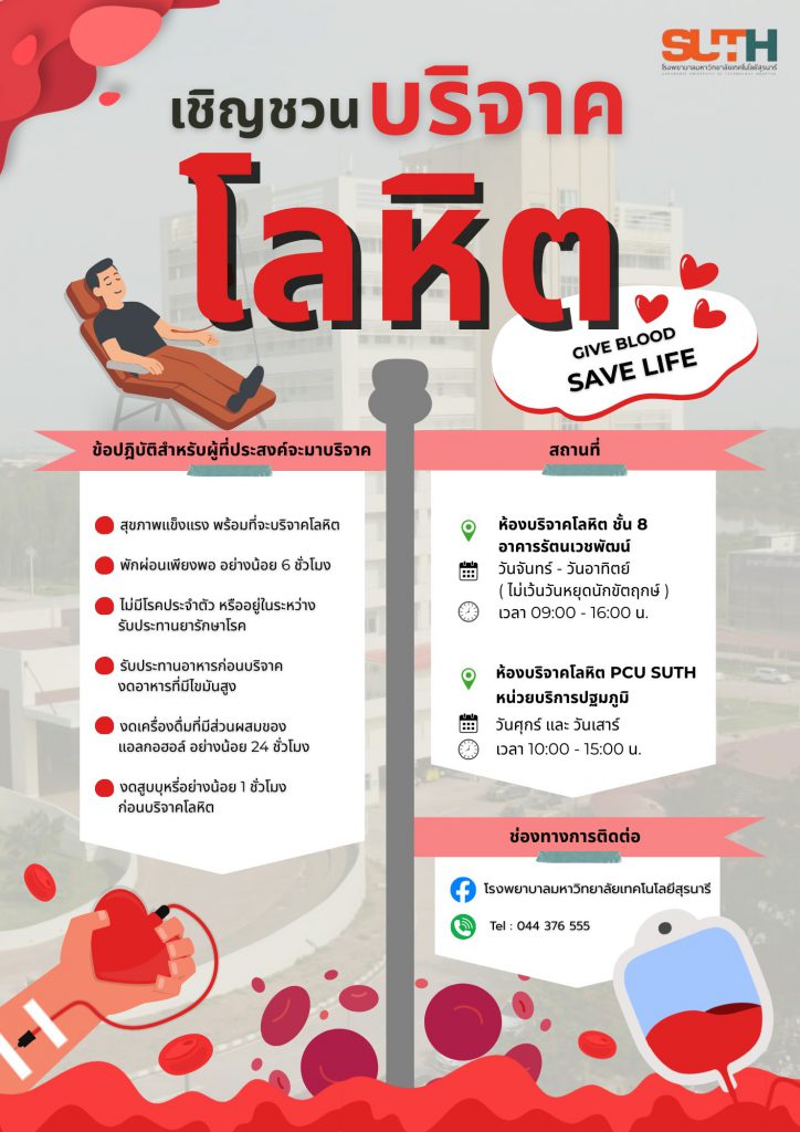 ประชาสัมพันธ์ :โรงพยาบาลมหาวิทยาลัยเทคโนโลยีสุรนารี ขอเชิญชวนมาร่วมบริจาคโลหิต เพื่อแบ่งปันสิ่งดี ๆ แก่ผู้อื่น