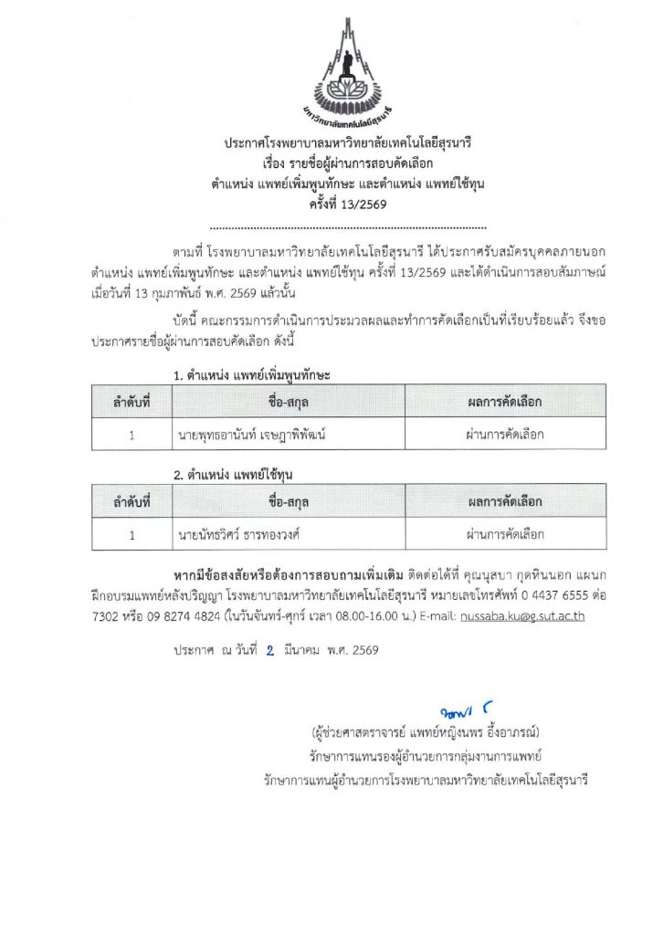 ประกาศ เรื่อง รายชื่อผู้ผ่านการคัดเลือก ตำแหน่งแพทย์เพิ่มพูนทักษะ และแพทย์ใช้ทุน ครั้งที่ 13/2569