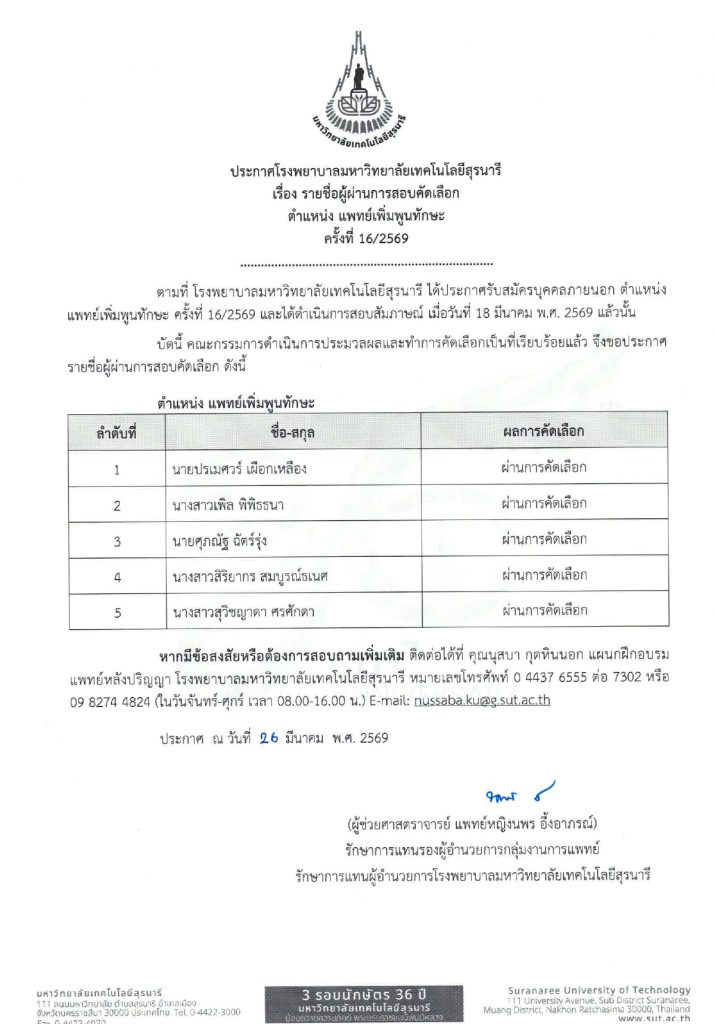 ประกาศ เรื่องรายชื่อผู้ผ่านการสอบคัดเลือก ตำแหน่ง แพทย์เพิ่มพูนทักษะ ครั้งที่ 16/2569